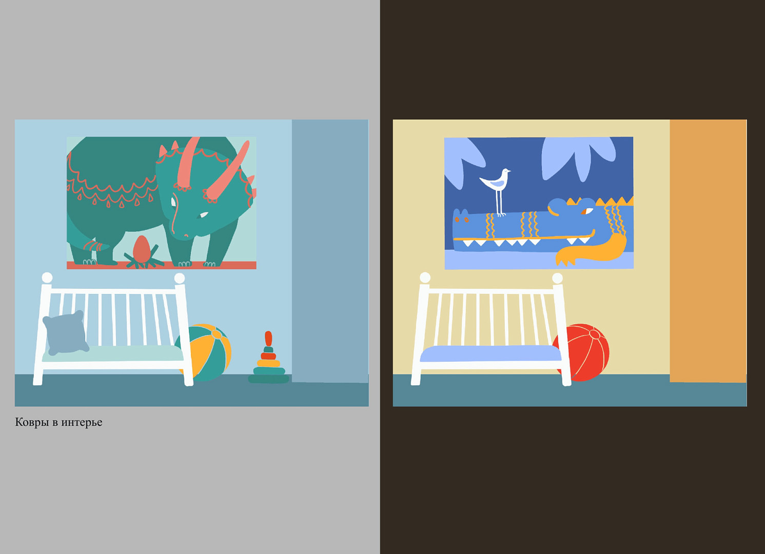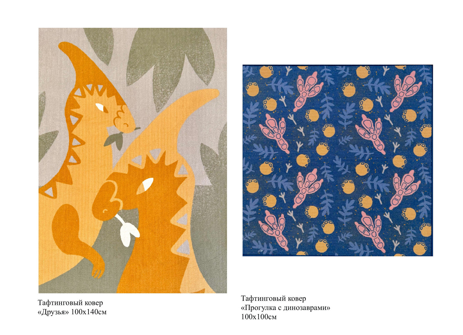 Данная коллекция разработана для детских пространств: садиков, творческих кружков, спален и игровых. В процессе создания проекта были изучены материалы о различных видах динозавров и их жизни. В коллекцию вошли два ковра 100 см х 140 см: «Трицераптопс» и «Друзья», а так же полотно 100 см х 100 см «Прогулка с динозаврами». В данных проектах использованы мягкая, но одновременно с этим насыщенная цветовая палитра. Это позволит вписать ковры в интерьер, а так же будет способствовать развитию малышей: изучение цвета и доисторических животных. Ковры гипоаллергенные и позволят развить сенсорную моторику.