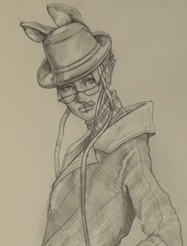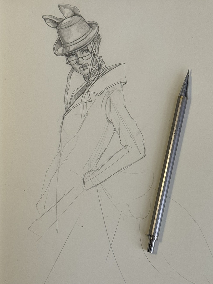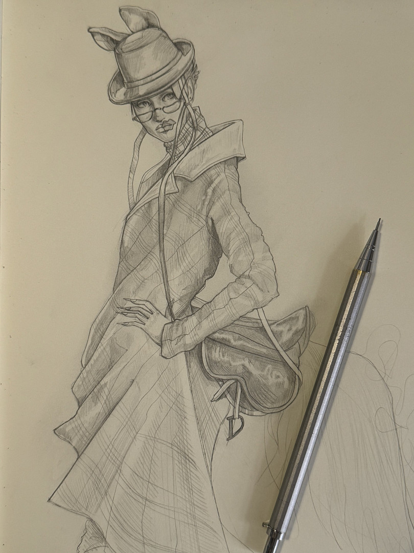 Иллюстрация, вдохновленная образом из кутюрной коллекции Дома Dior (осень 2000). Графика, А4.