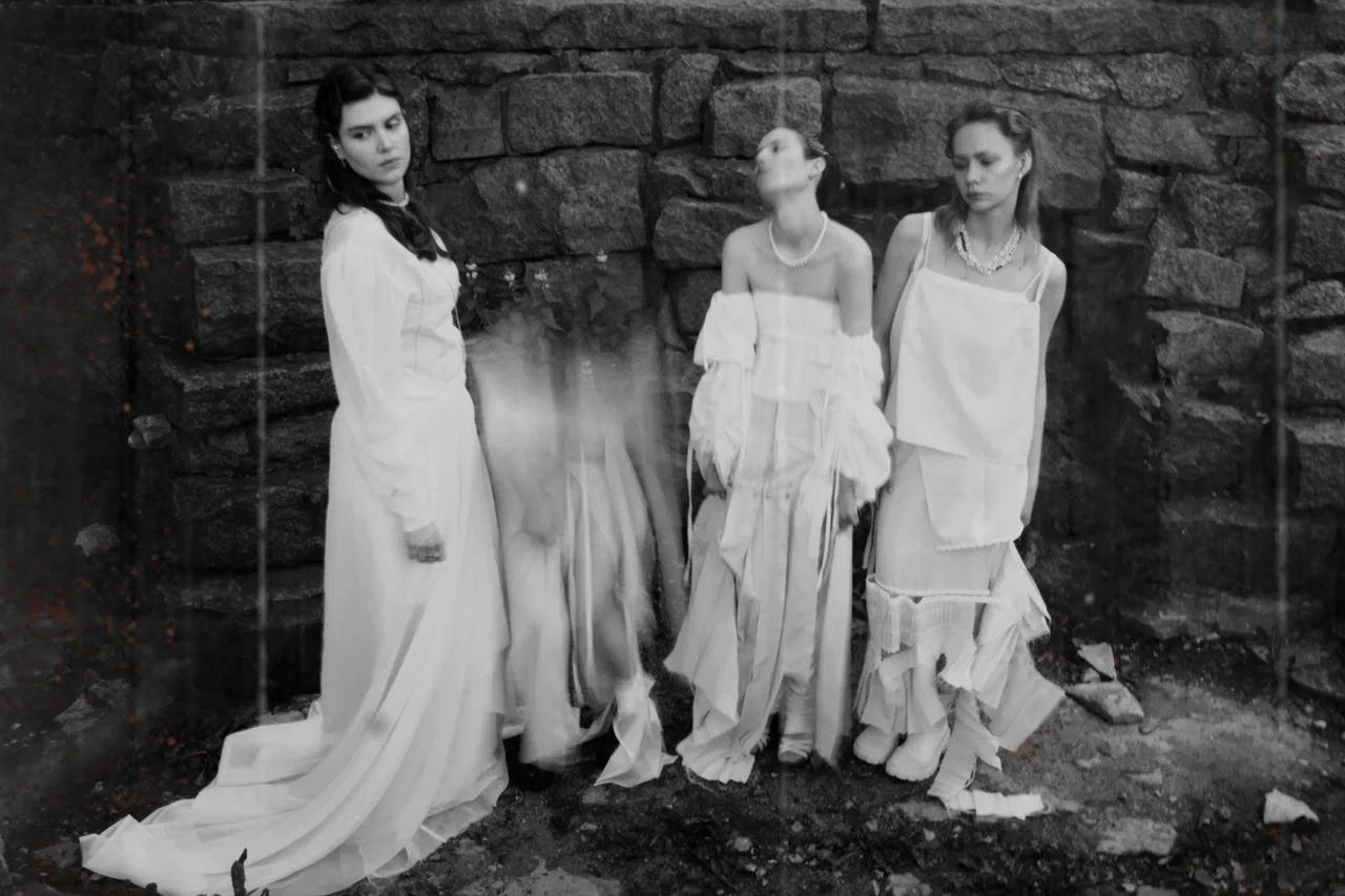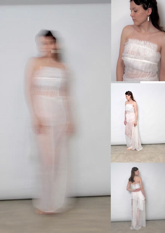 Образы сочетают плотные фактурные ткани с прозрачными текстурами. Присутствуют ассиметрия, складки, объемные формы, минималистичные детали, скрытые застежки, мягкие линии.