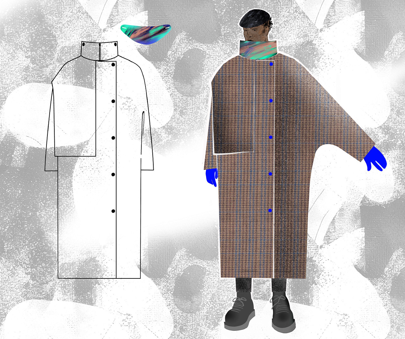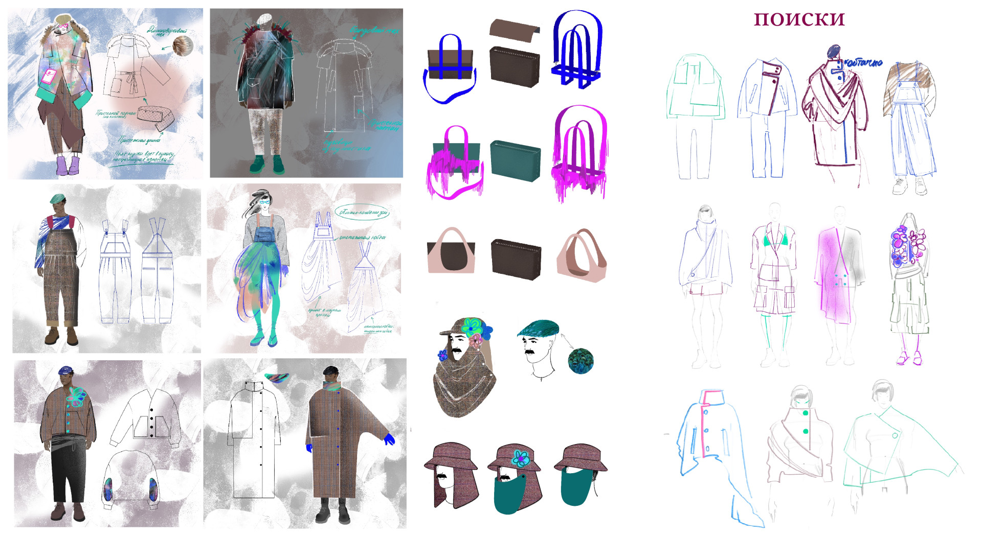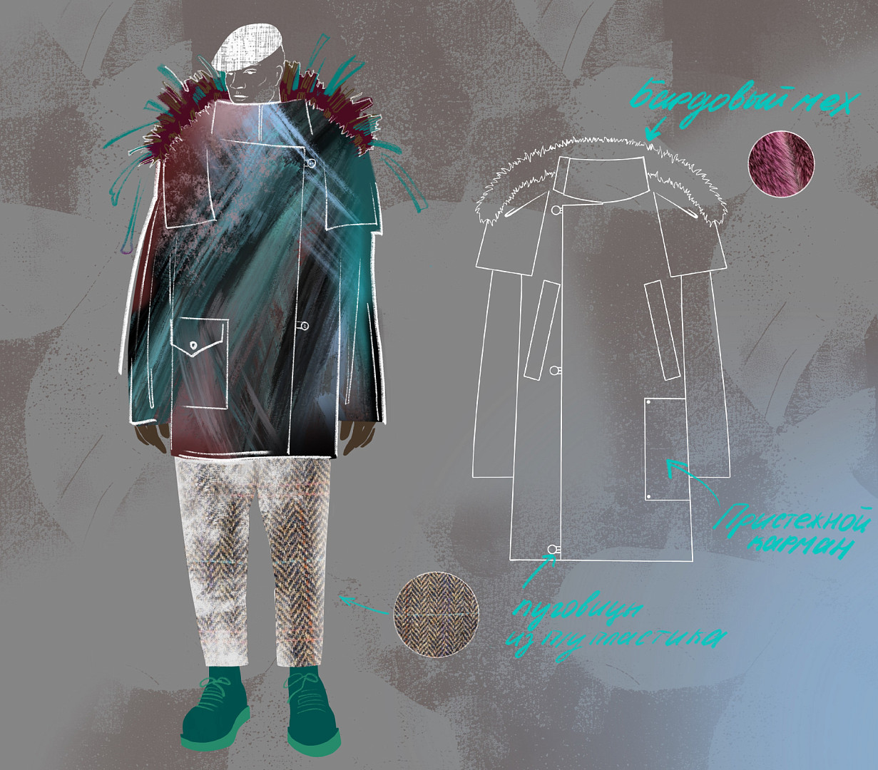 В моделях соединены различные ткани, которые на первый взгляд могут не сочетаться, такие как клетчатый твид и плащевка с абстрактным принтом. Противоположные по свойствам материалы создают контраст, который имеет такое важное значение в живописи. Столкновение противоположных текстур создает эмоциональное напряжение. Так же, в работах используются насыщенные, глубокие цвета. Многослойные образы зачастую имеют не один цветовой акцент в одном комплекте, а сразу несколько. Было важно показать, что обилие цветов и текстур могут гармонично держаться в едином образе.