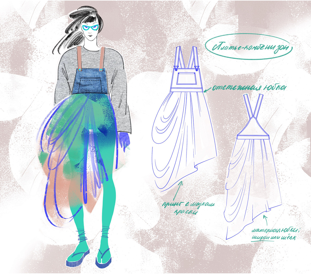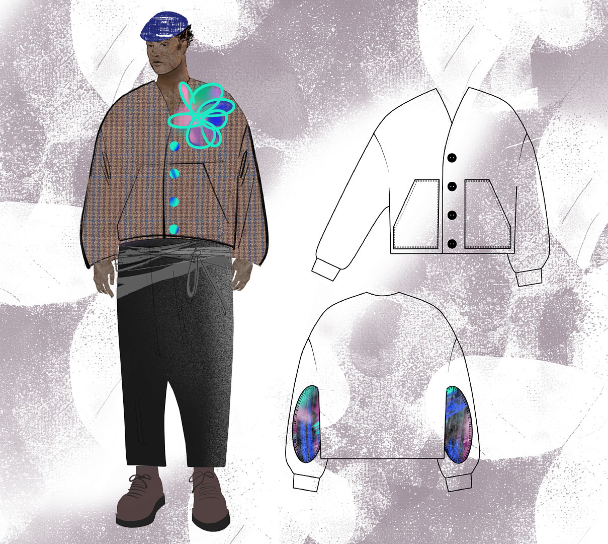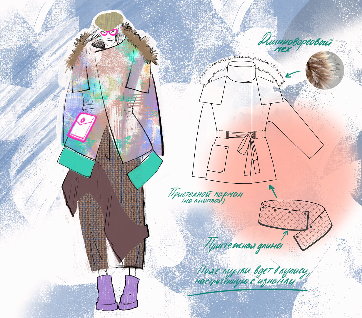 В моделях соединены различные ткани, которые на первый взгляд могут не сочетаться, такие как клетчатый твид и плащевка с абстрактным принтом. Противоположные по свойствам материалы создают контраст, который имеет такое важное значение в живописи. Столкновение противоположных текстур создает эмоциональное напряжение. Так же, в работах используются насыщенные, глубокие цвета. Многослойные образы зачастую имеют не один цветовой акцент в одном комплекте, а сразу несколько. Было важно показать, что обилие цветов и текстур могут гармонично держаться в едином образе.