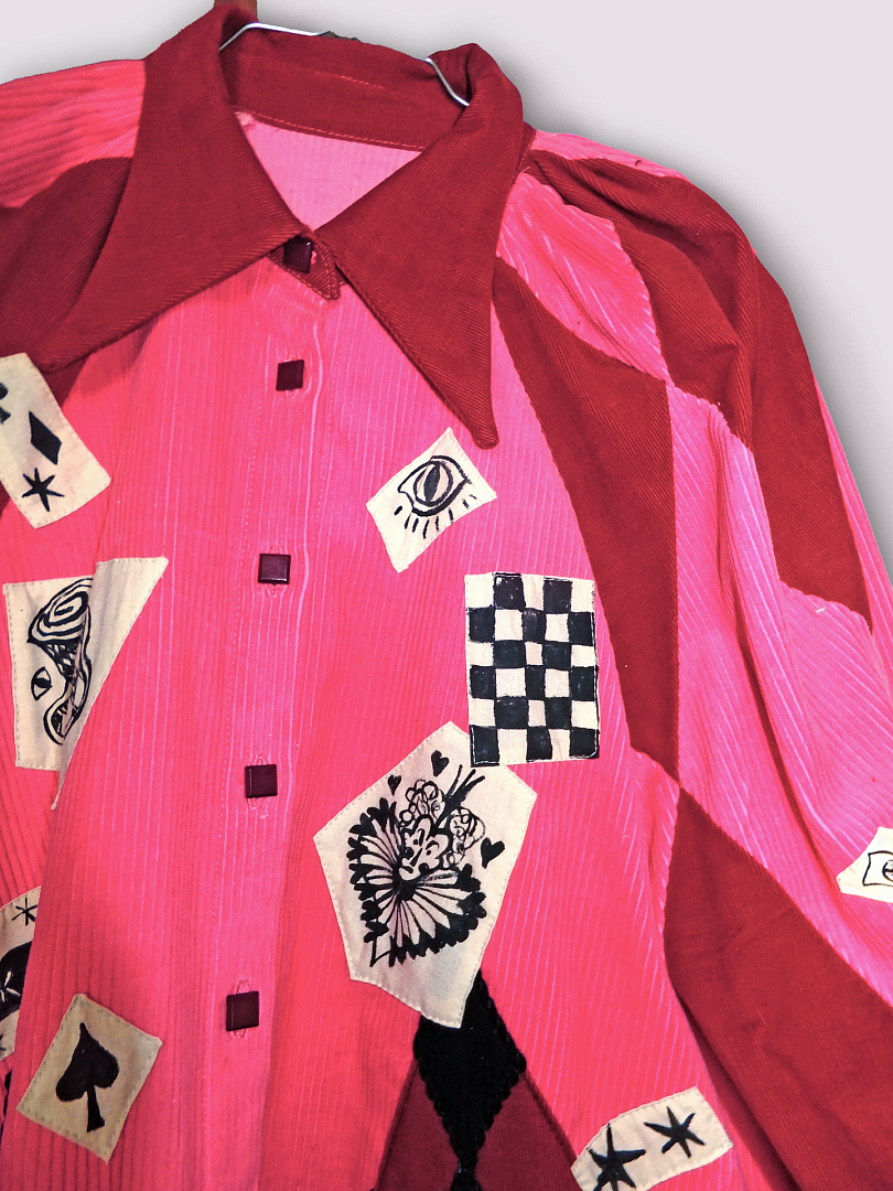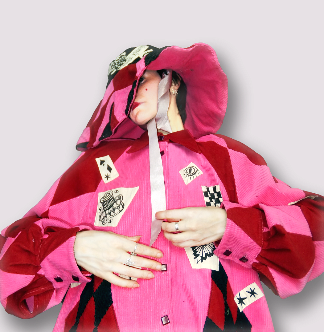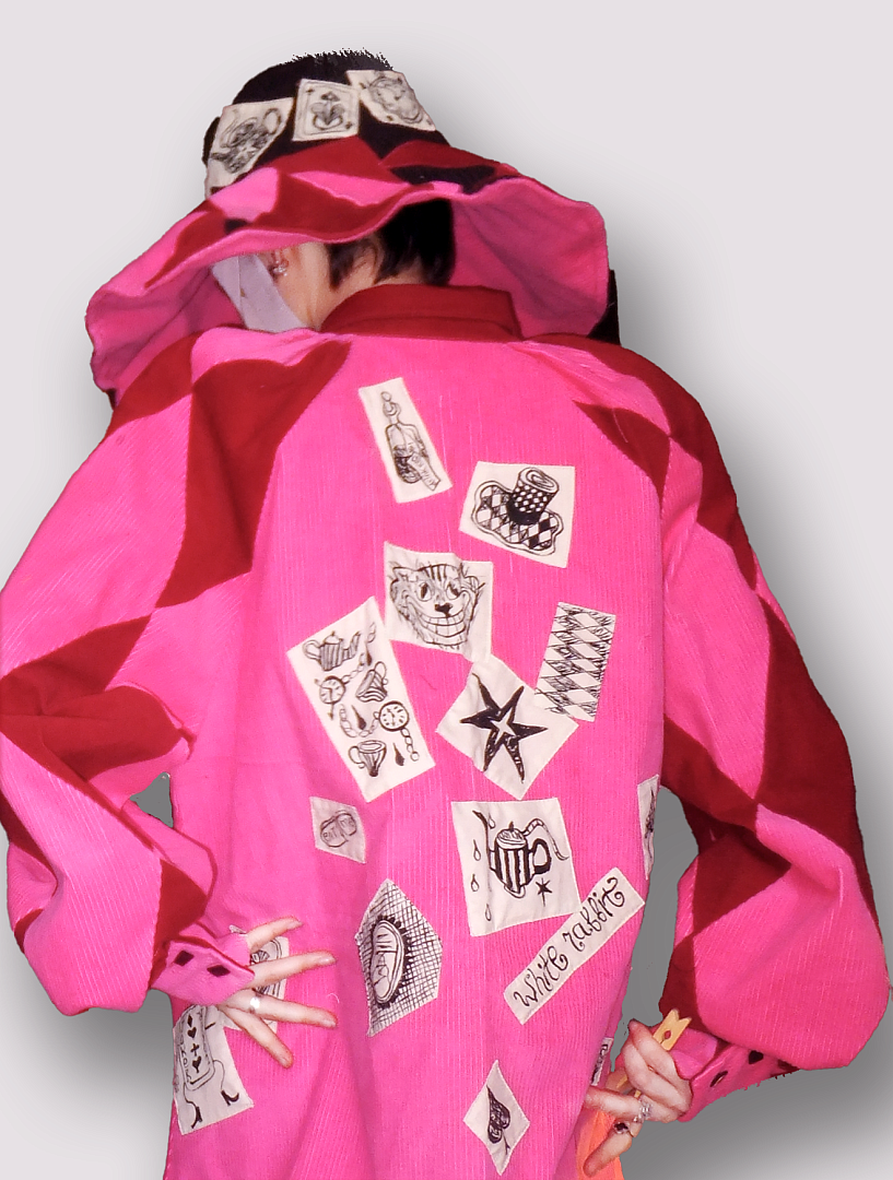Розовый цвет, выбранный для комплекта, выходит за рамки стереотипов и становится символом творческой свободы и смелых экспериментов с собственным стилем. Графичные рукописные бирки с символами - атрибутами из сказки, а также лоскутные техники и элементы "незавершенности" добавляют комплекту игривости и индивидуальности. Они напоминают о ручном труде и ценности уникальных вещей в эпоху цифровых технологий.