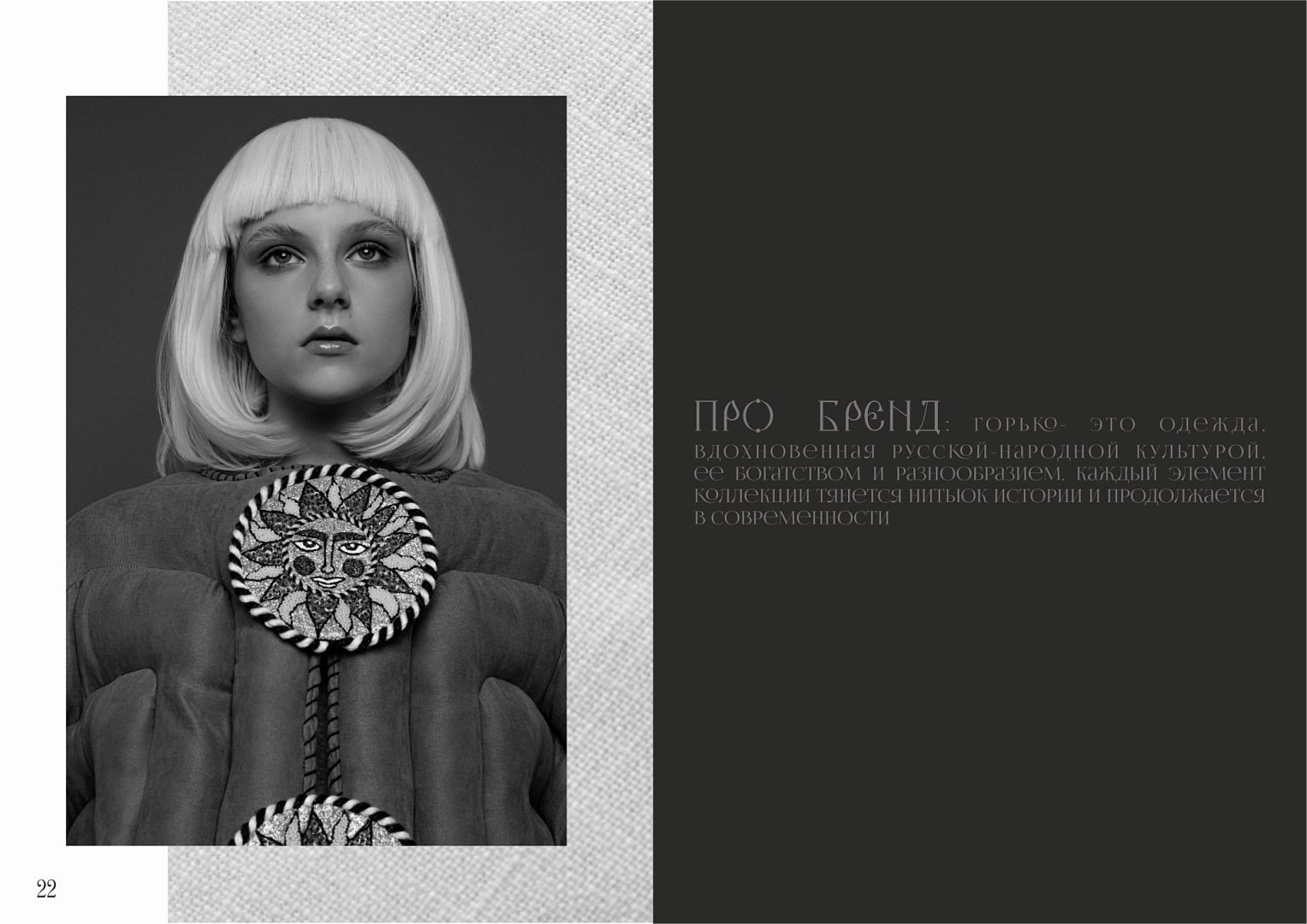 Про бренд: горько- это одежда, вдохновенная русской-народной культурой, ее богатством и разнообразием. Каждый элемент коллекции тянется нитью к истории и продолжается в современности