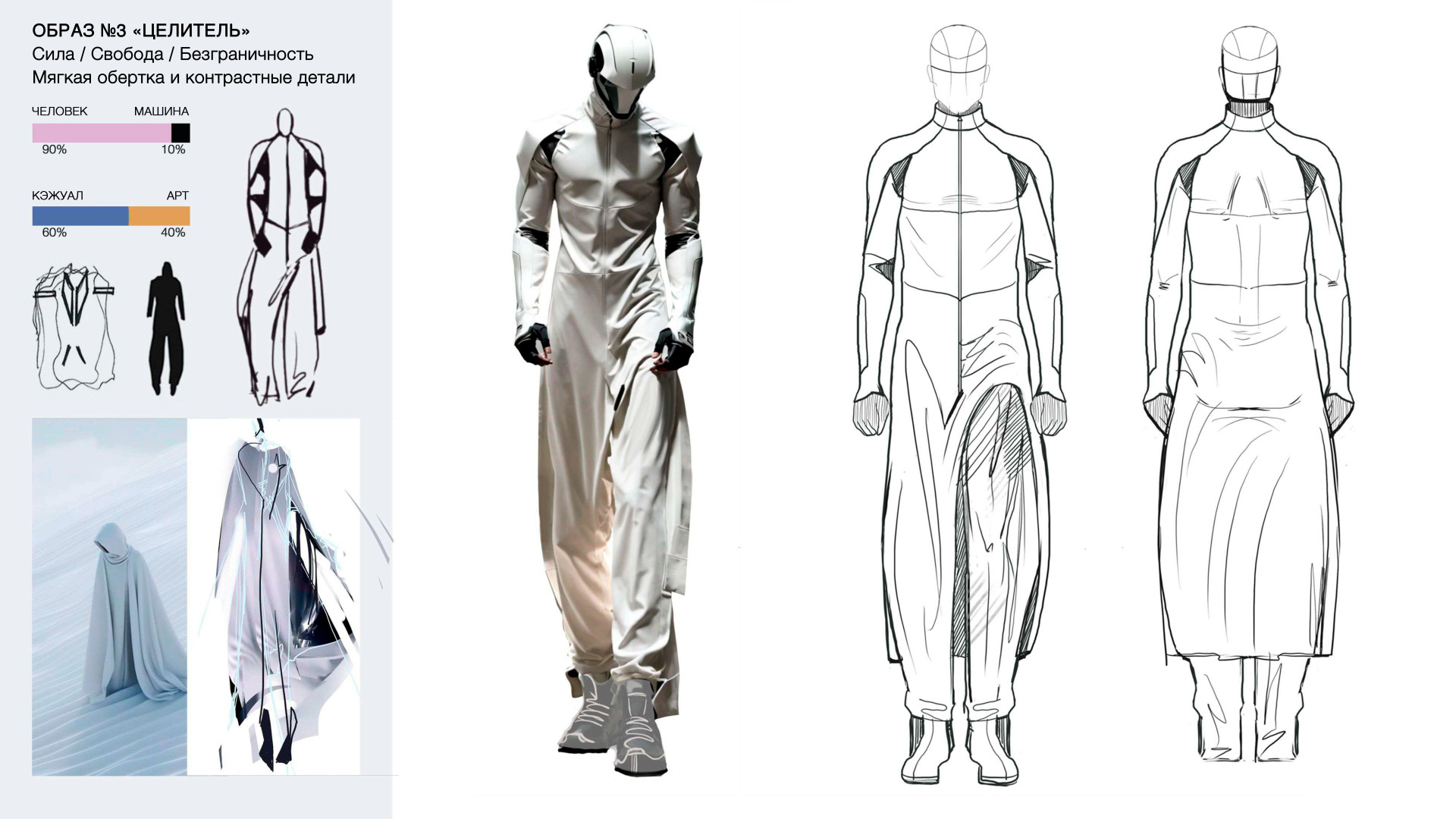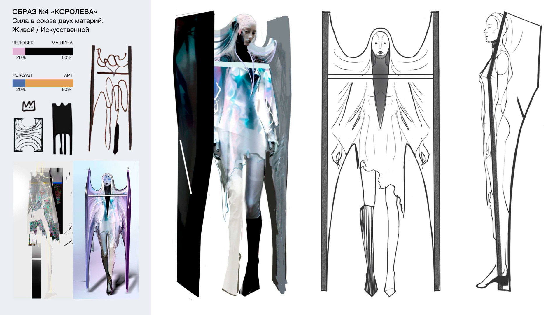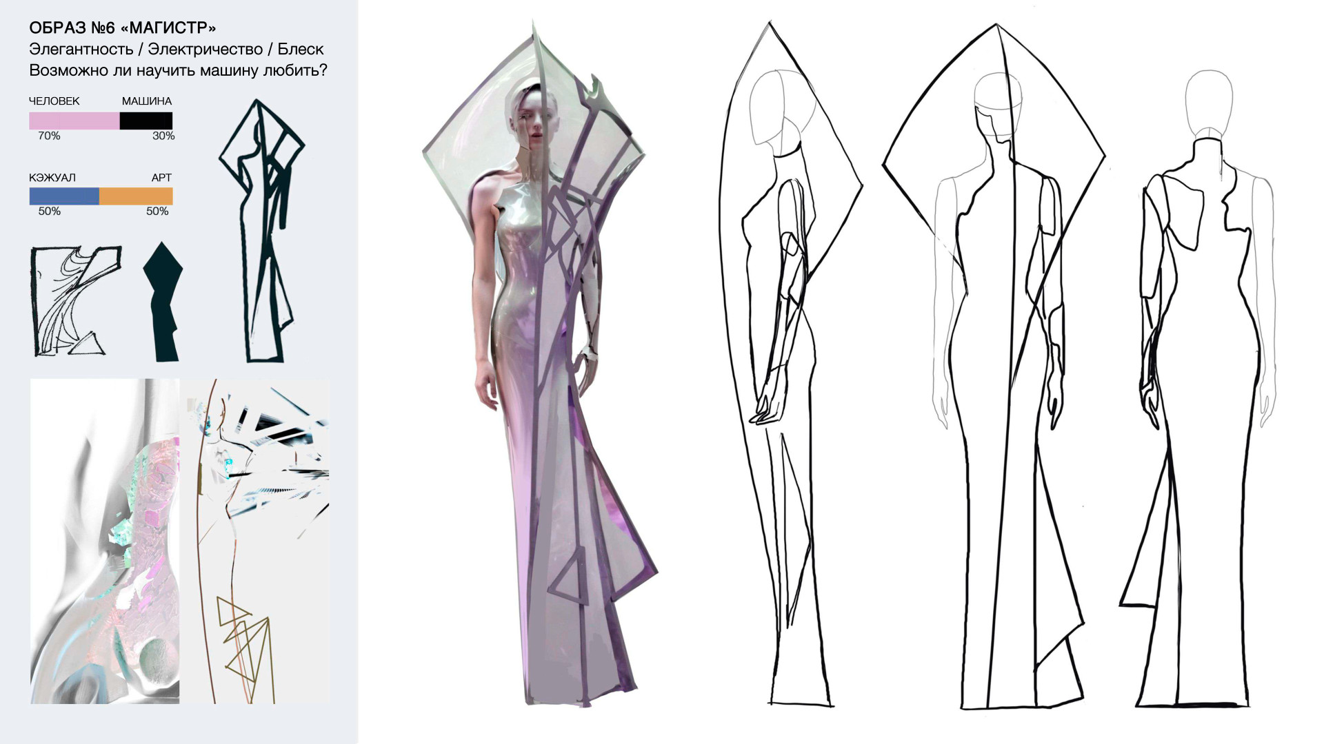Замысел коллекции заключается в союзе машина-человек-костюм, в отражении гармоничного слияния человеческого существа и технологических достижений, при котором техника становится неотъемлемой частью человеческого опыта и самовыражения, а не просто инструментом или внешним дополнением.
