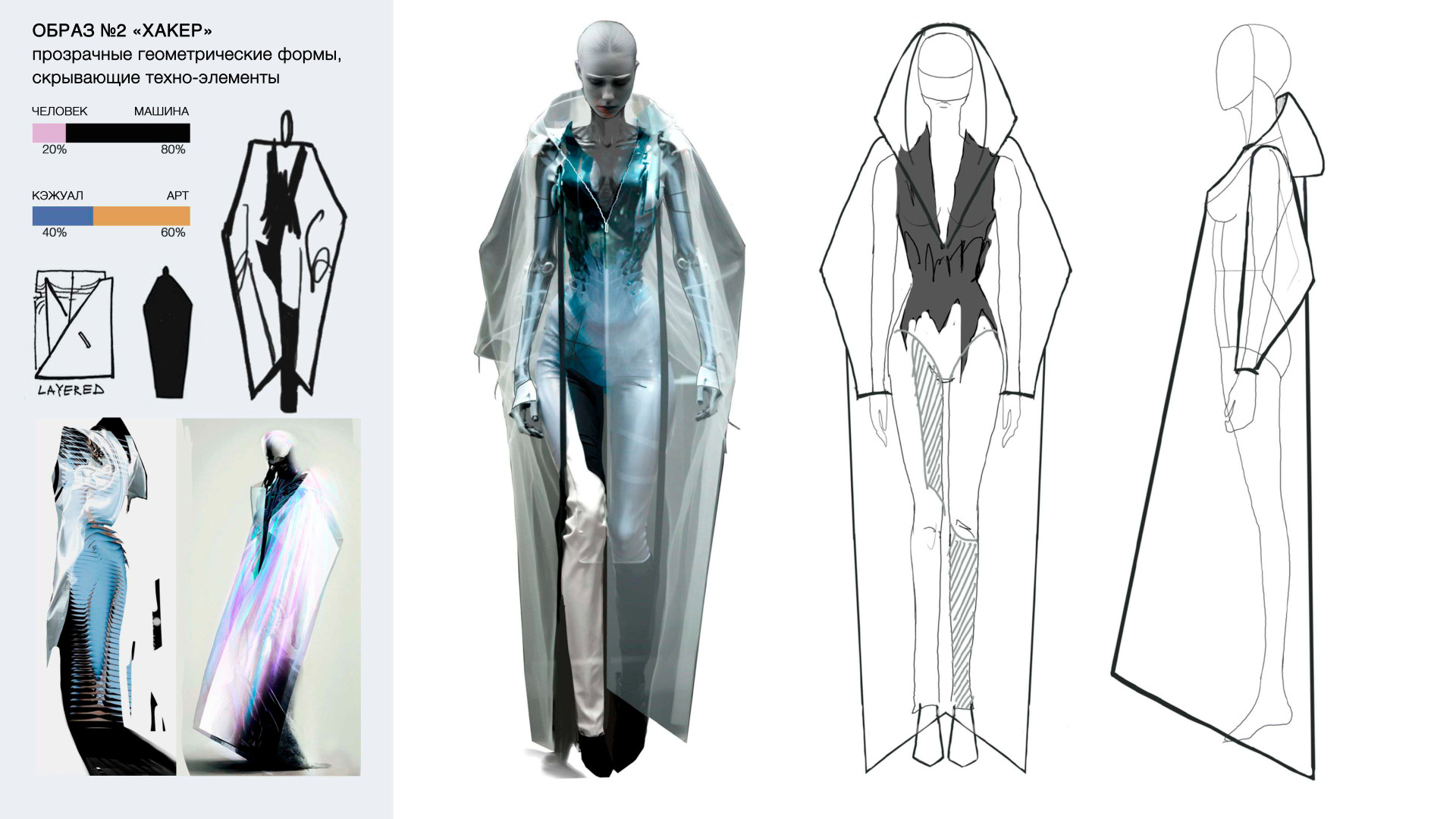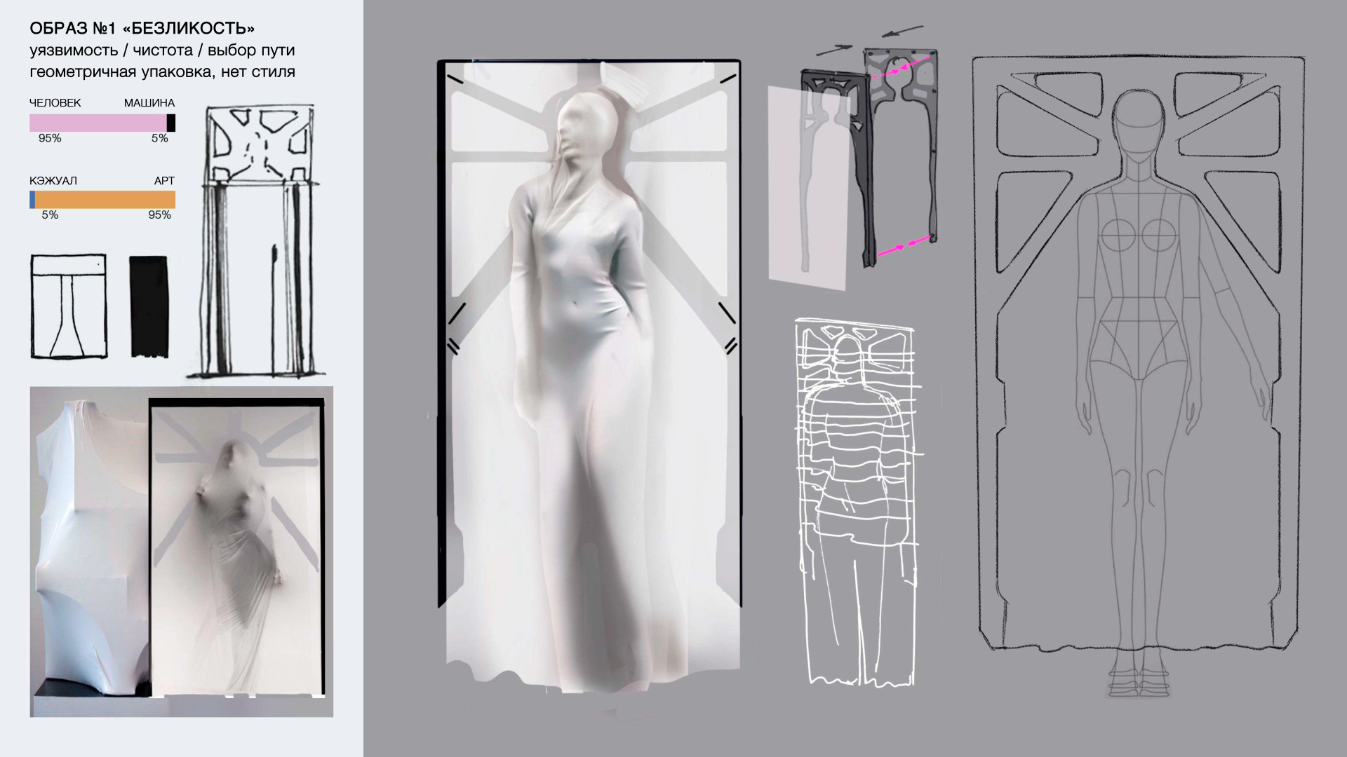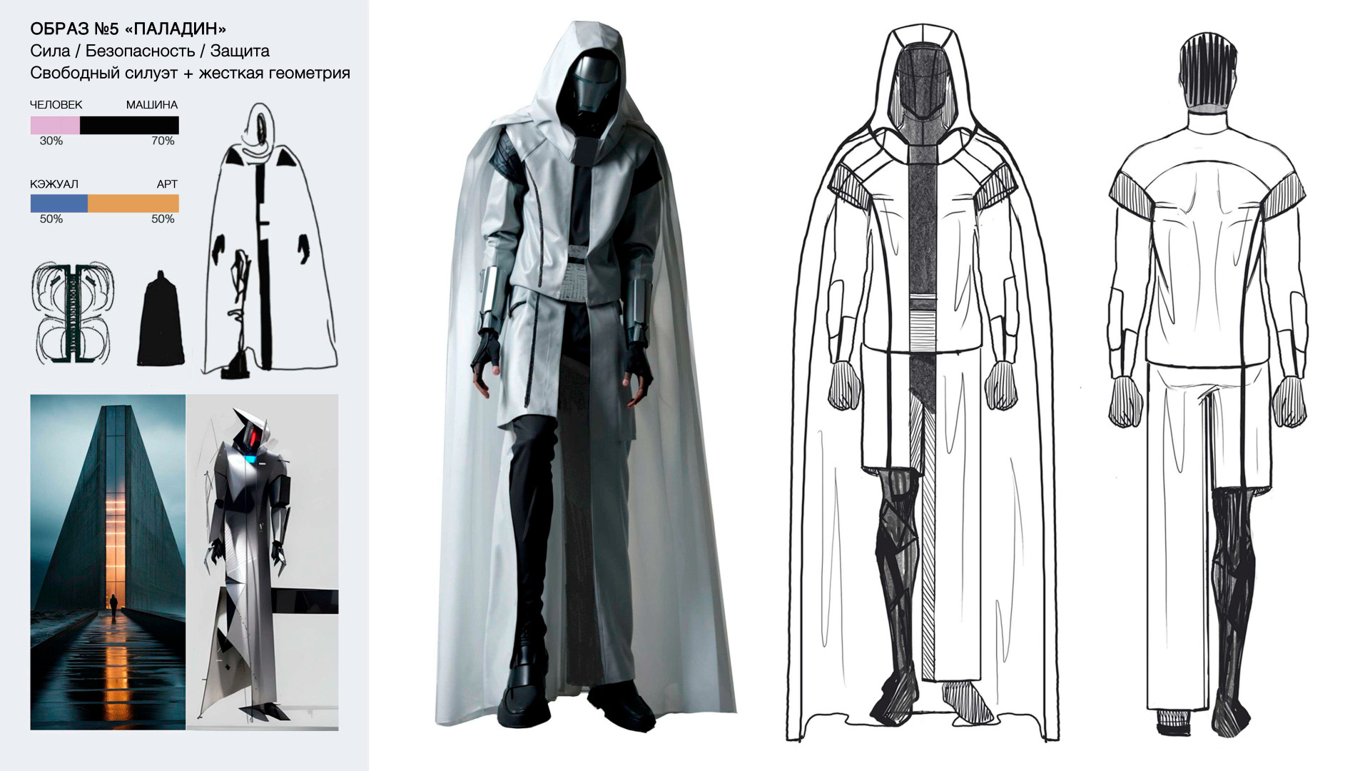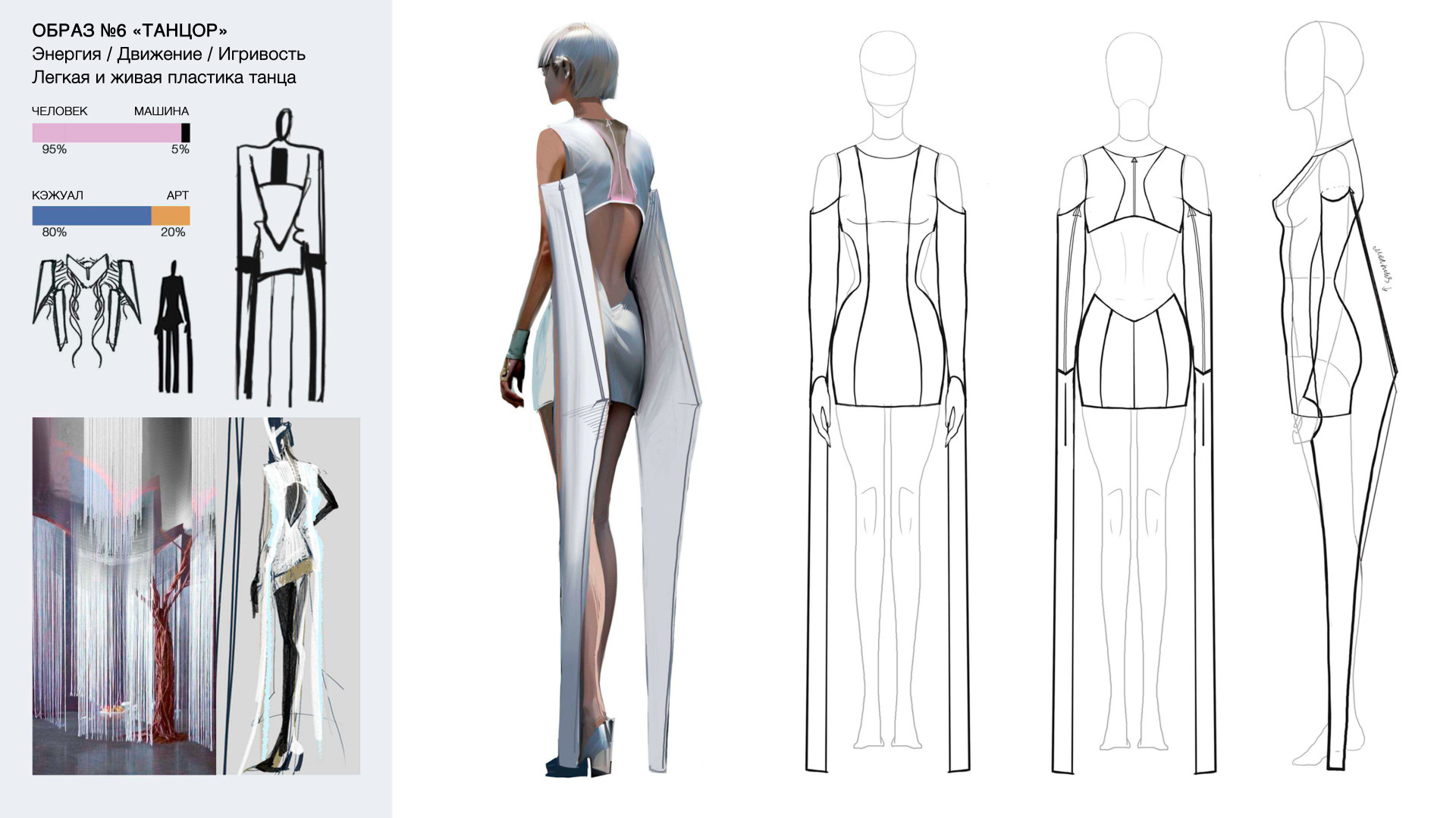Замысел коллекции заключается в союзе машина-человек-костюм, в отражении гармоничного слияния человеческого существа и технологических достижений, при котором техника становится неотъемлемой частью человеческого опыта и самовыражения, а не просто инструментом или внешним дополнением.