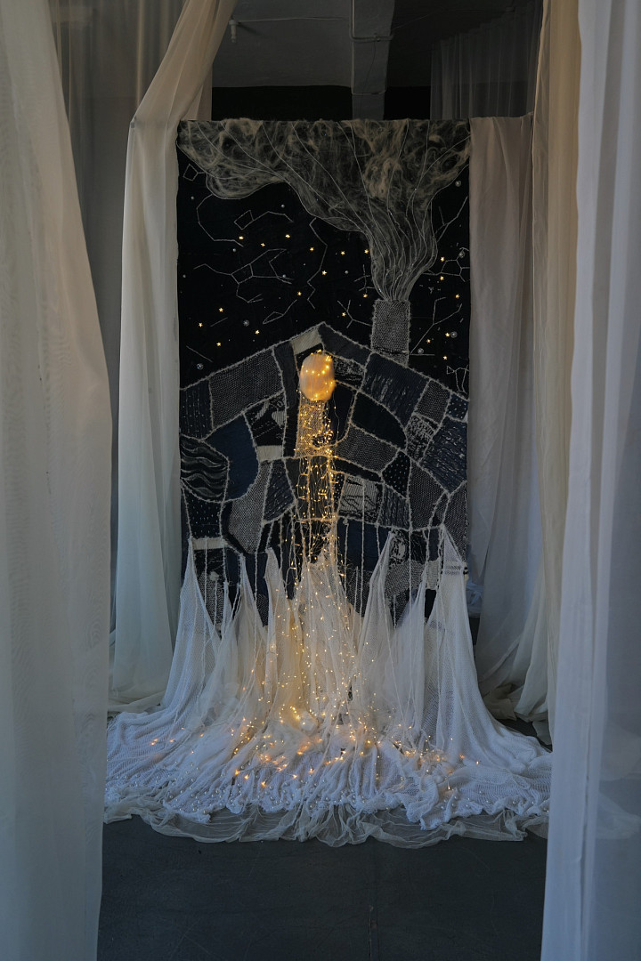 На основе рефлексий было создано текстильное панно, монументальное, авторское, с использованием смешанных техник и материалов. В работе затрагивается проблема экологичности, арт-объект выполнен из трикотажных отходов с применением светодиодных лент.