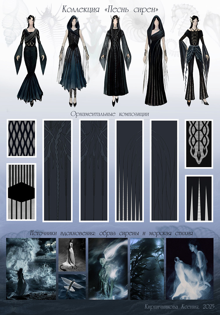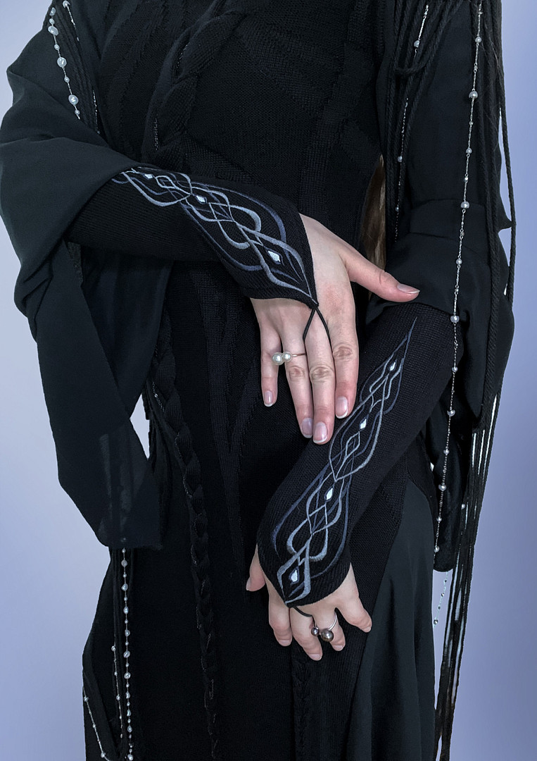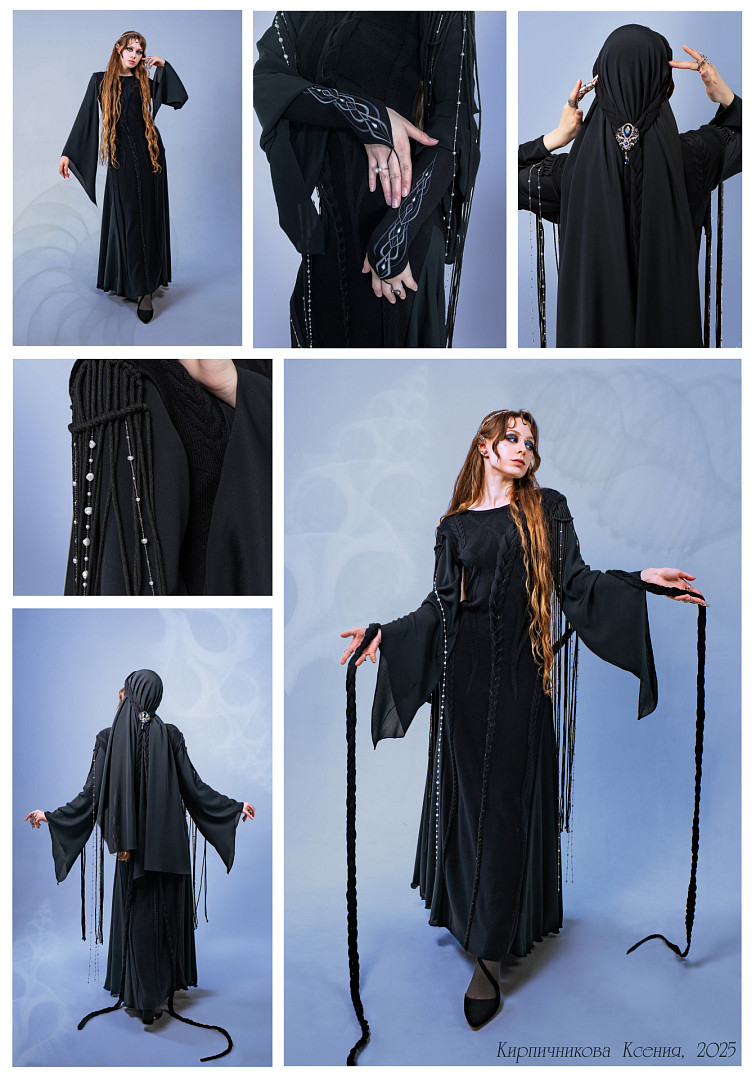 Вдохновением для модели «Узы покорности» послужил образ сирены — символа притягательности, внутренней силы и скрытой угрозы. Целью было добиться органичного соединения различных материалов в рамках одного изделия. В конструкцию трикотажного платья интегрированы детали из крепдешина, орнамент, элементы макраме, вышивка, декоративные цепи и жемчуг. Объединяются материалы с разной фактурой и растяжимостью. Образ дополняют головной убор и митенки.