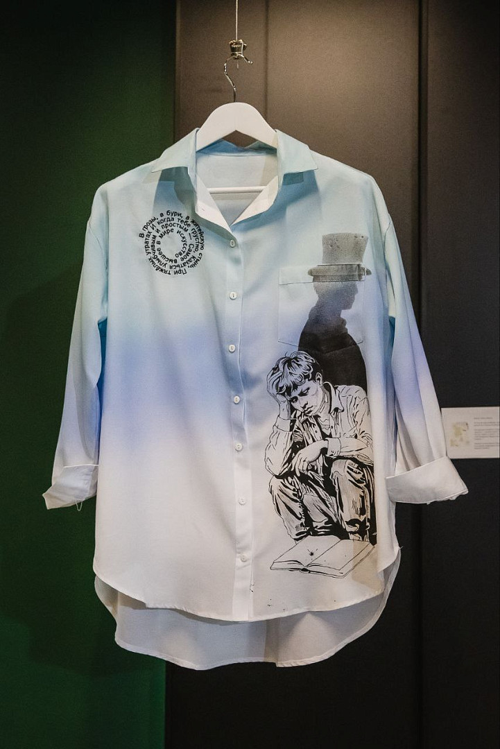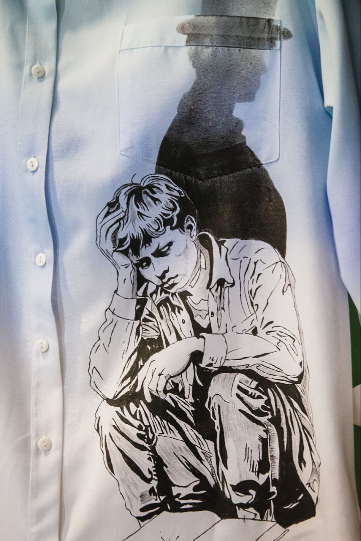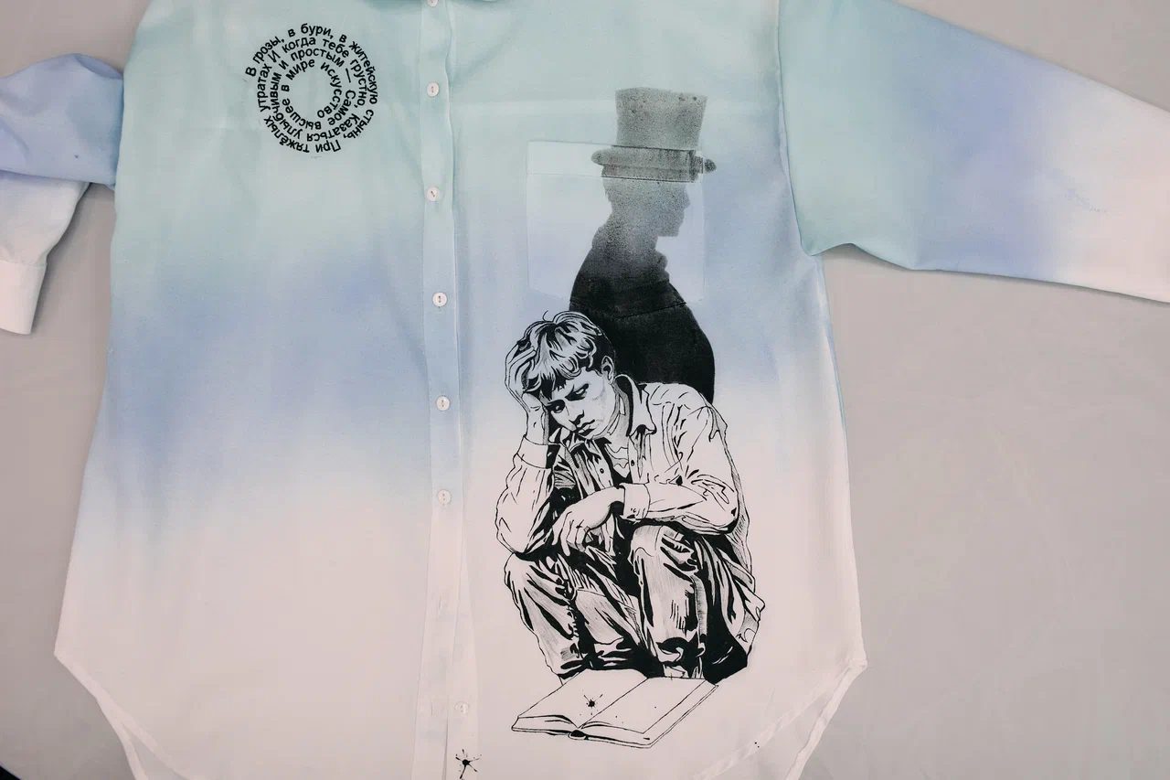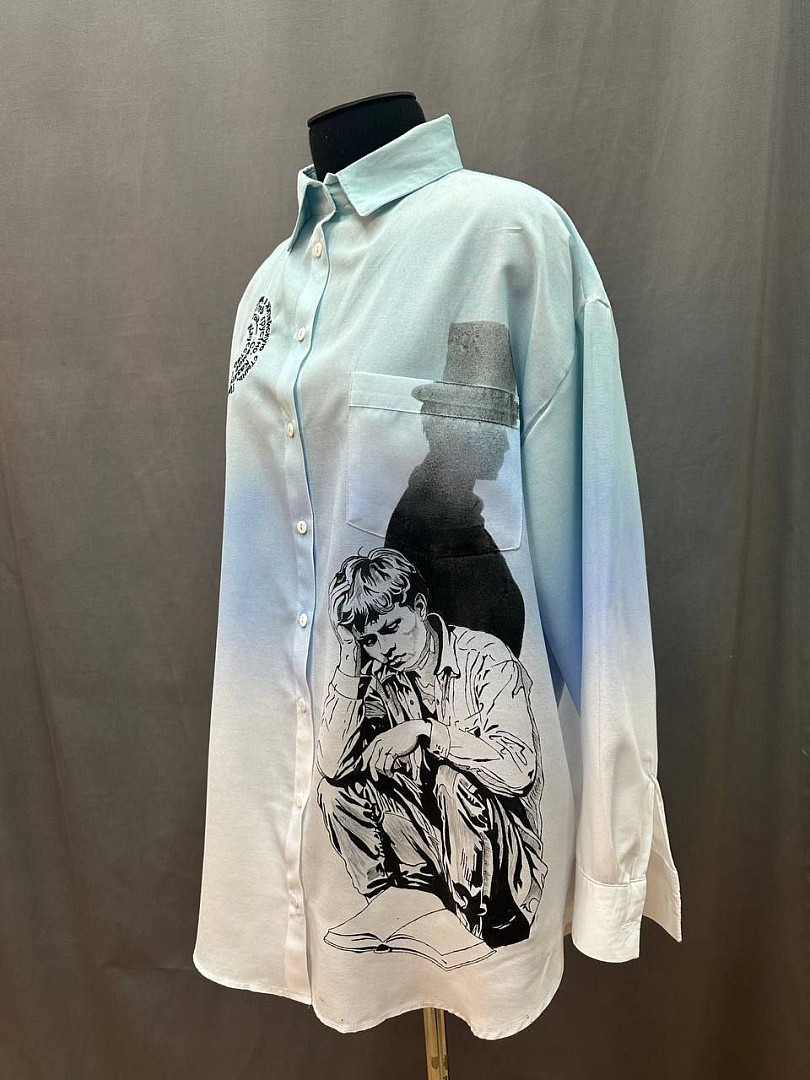 Концепция дизайна: Градиентный эффект достигается нанесением красителя на рубашку с помощью аэрографа. Изображение "Чёрного человека" выполнено вручную, надпись - машинной вышивкой.