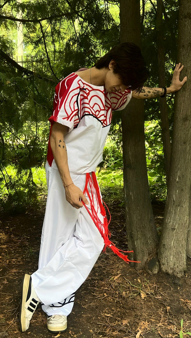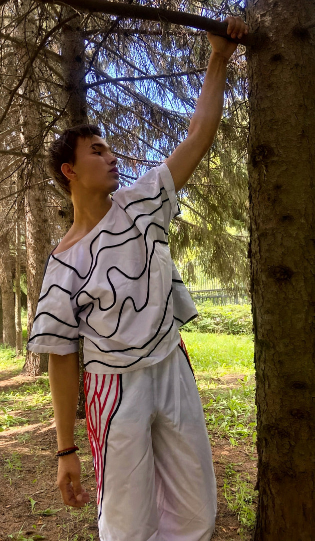 Коллекция выполнена на основе геометрического кроя из ткани «ТИСИ» трех цветов. Декор выполнен из черного и белого трикотажа.