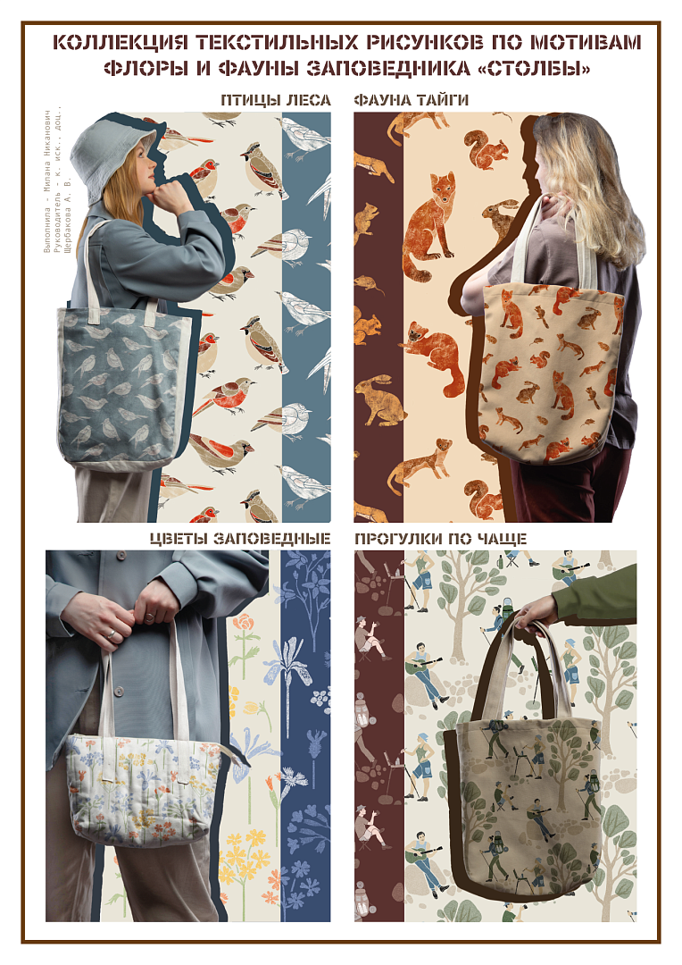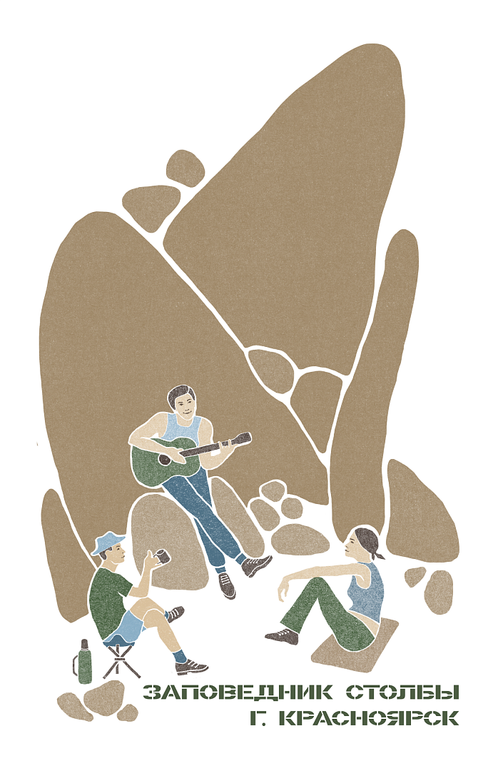 Коллекция текстильных рисунков по мотивам флоры и фауны заповедника Столбы в городе Красноярск. В ней отображены пейзажи местности, туристы, растения и животные заповедника. Идея коллекции -- отобразить атмосферу отдыха в парке в рисунках для сувенирной продукции, чтобы посетитель мог забрать кусочек столбов с собой. Стилистика коллекции вдохновлена советскими плакатами об экологии и туризме.