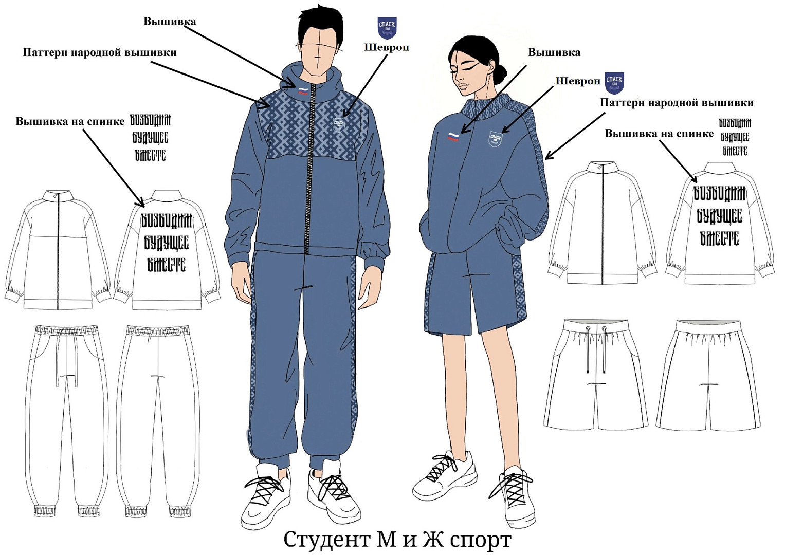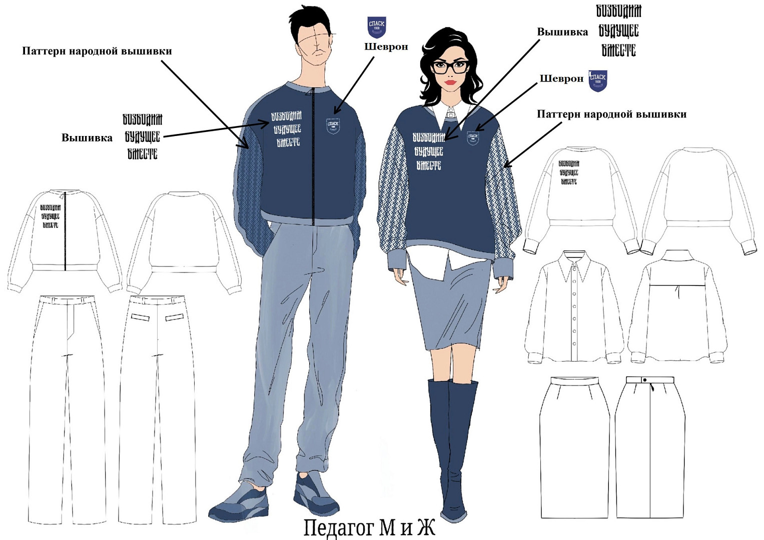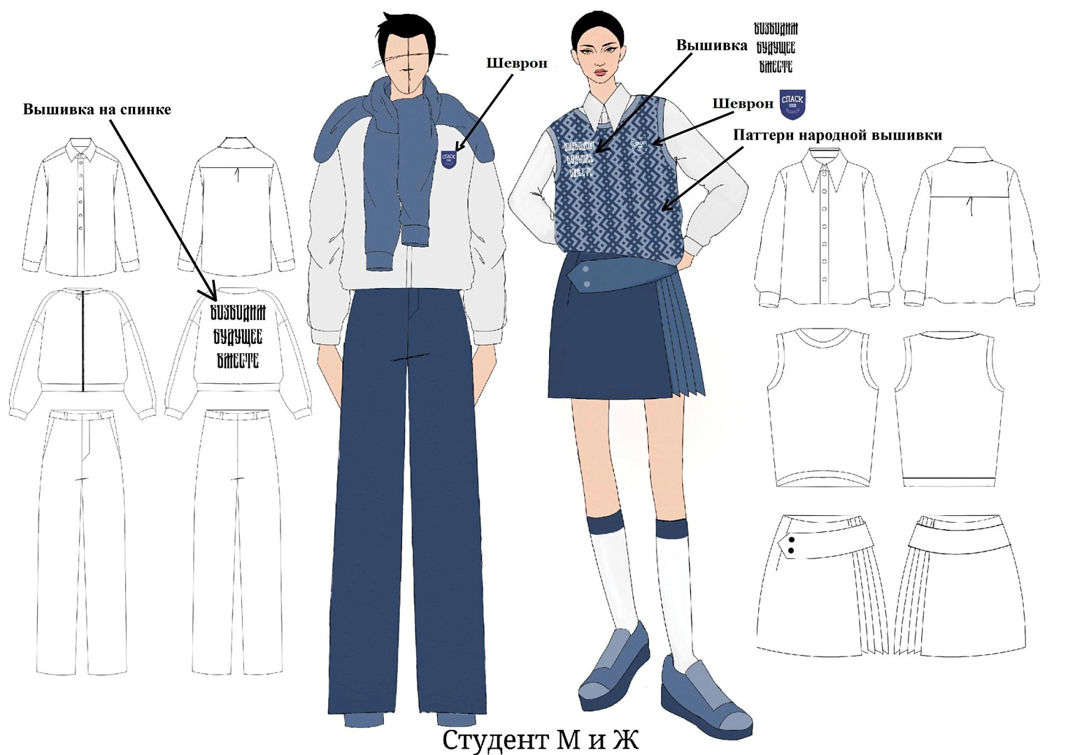 Представлена школьная форма для студентов и униформа для преподавателей. Источником вдохновения стала славянская вязь и славянская вышивка.